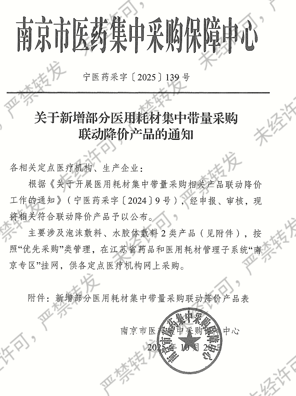 各相關定點醫療機構、生產企業: 根據《關于開展醫用耗材集中帶量采購相關產品聯動降價工作的通知》(寧醫藥采字〔2024〕9號),經申報、審核,現將相關符合聯動降價產品予以公布。 主要涉及泡沫敷料、水膠體敷料2類產品(見附件),按照“優先采購”類管理,在江蘇省藥品和醫用耗材管理子系統“南京專區”掛網,供各定點醫療機構網上采購。