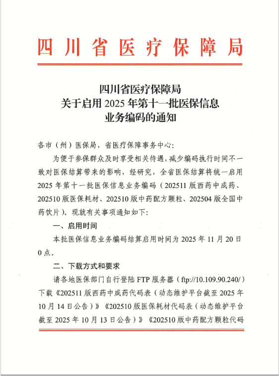 為便于參保群眾及時享受相關待遇,減少編碼執行時間不一致對醫保結算帶來的影響,經研究,全省醫保結算將統一啟用2025年第十一批醫保信息業務編碼(202511版西藥中成藥、202510版醫保耗材、202510版中藥配方顆粒、202504版全國中藥飲片)。現就有關事項通知如下: