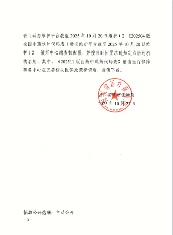 請各地醫保部門自行登陸FTP服務器(ftp://10.109.90.240/)下載《202511版西藥中成藥代碼表(動態維護平臺截至2025年10月14日公告)》《202510版醫保耗材代碼表(動態維護平臺截至2025年10月13日公告)》《202510版中藥配方顆粒代碼表(動態維護平臺截至2025年10月20日維護)》《202504版全國中藥飲片代碼表(動態維護平臺截至2025年10月20日維護)》,做好中心端參數配置;并按照時間要求通知定點醫藥機構啟用。其中,《202511版西藥中成藥代碼表》請省醫療保障事務中心在完善相關醫保政策標識后,提供下載。