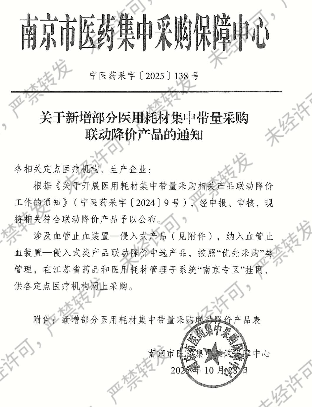 涉及血管止血裝置—侵入式產品(見附件),納入血管止血裝置—侵入式類產品聯(lián)動降價中選產品,按照“優(yōu)先采購”類管理,在江蘇省藥品和醫(yī)用耗材管理子系統(tǒng)“南京專區(qū)”掛網(wǎng),供各定點醫(yī)療機構網(wǎng)上采購。