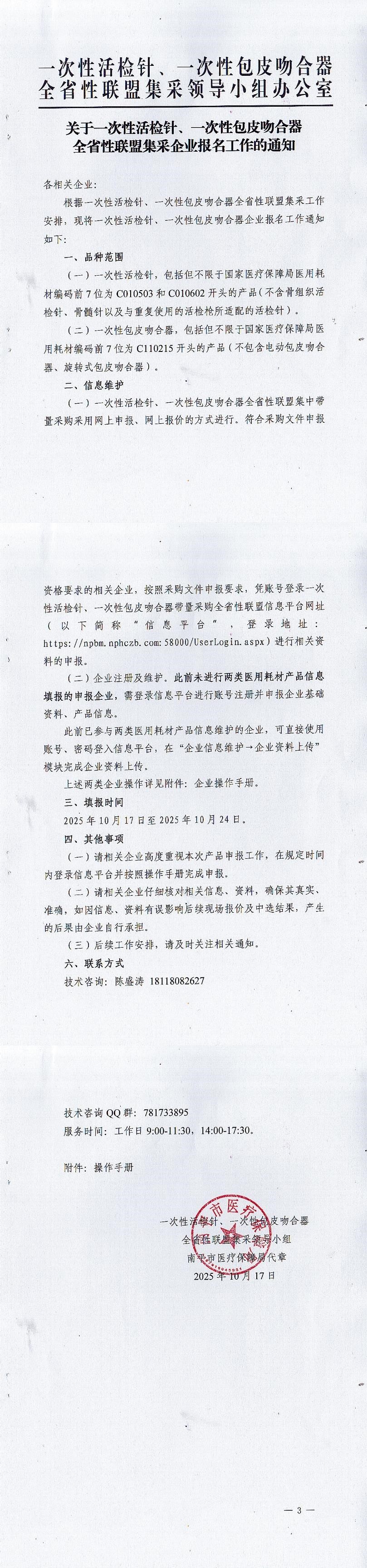 根據(jù)一次性活檢針、一次性包皮吻合器全省性聯(lián)盟集采工作安排,現(xiàn)將一次性活檢針、一次性包皮吻合器企業(yè)報名工作通知如下: