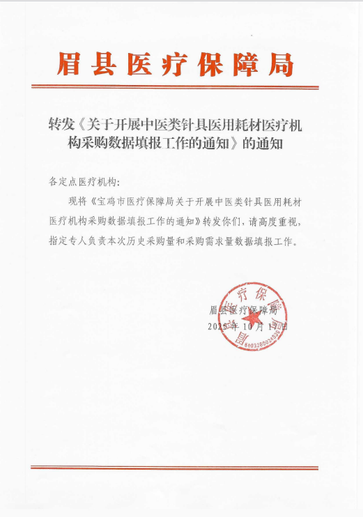 各定點醫療機構: 現將《寶雞市醫療保障局關于開展中醫類針具醫用耗材醫療機構采購數據填報工作的通知》轉發你們,請高度重視,指定專人負責本次歷史采購量和采購需求量數據填報工作。 眉縣醫療保障局 2025年10月17日